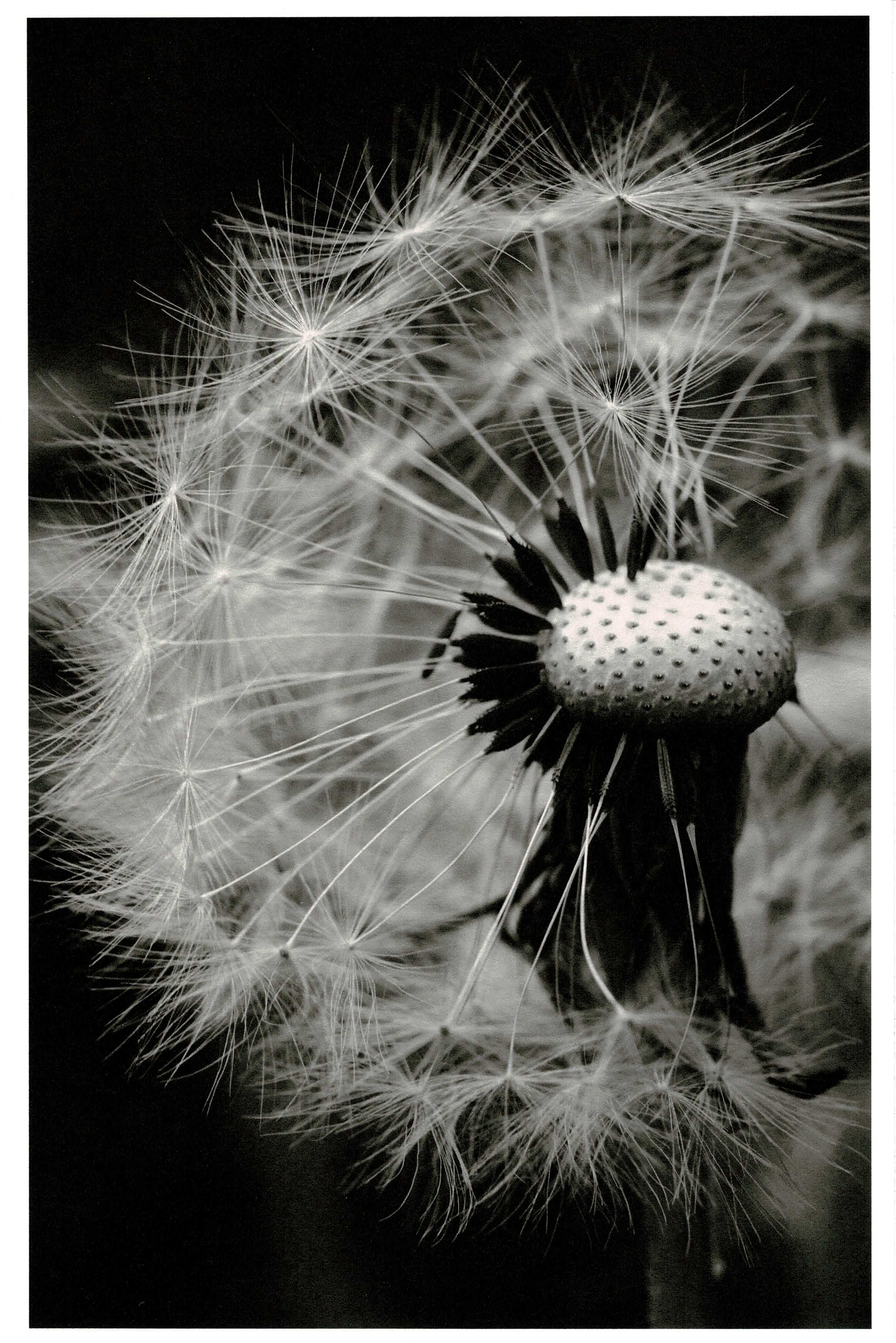 Խատուտիկի նուրբ սպիտակ մազիկները լղոզված չեն ու հստակ երևում են մուգ սև ֆոնի վրա։